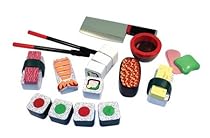 Sushi anyone' This slicing sushi set is a meal fit for an emperor! It comes with three types of pretend-play sushi rolls -- shrimp, tuna and salmon roe -- plus egg toppings and a few more condiment "extras." Includes chopsticks and cleaver, too. 24 pieces in all. Measures 9" x 10" x 1.5".