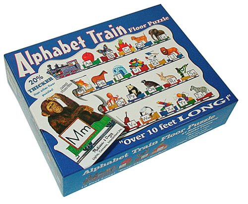 Aside from these relatively minor flaws, this puzzle is fantastic. There are 28 pieces. Two pieces form the locomotive and the other 26 pieces correspond to a train car illustrated with a letter in upper and lower case and an animal (except for the aforementioned umbrella) that starts with that letter (except for the fox for x). The puzzle is 10 feet long, so you need a big space to put it together. My daughter loves how long it is. And I love that it is one long puzzle because this forces my daughter to think about the alphabet song, identify the letter that comes next, search for and find the letter she identified and then fit that letter into the puzzle. Before she got this puzzle, I *thought* she knew her letters and the alphabet. However, I realized that she didn't really think about each letter she sang in the song as corresponding to a with a letter in the written form. Similarly, while she could identify a letter as written when we showed it to her, she found it challenging to think about alphabetical order and hunt for the correct letter - she had to picture the letter in her mind in order to locate the letter. Thus, this puzzle was highly educational for her. When we first got the puzzle, each time we sat with her and sang the ABC song with her as we pointed to the letters. When we got to the last letter she had fitted into the puzzle, we would pause and ask what comes next. Once she identified that letter, she would search to it and we'd repeat our previous procedure, singing the alphabet song and identifying the next letter.