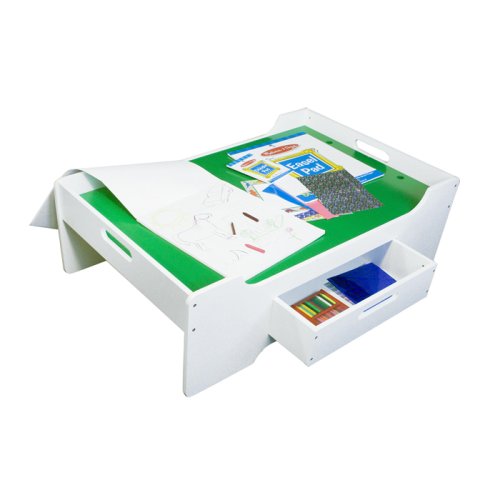 Large, sturdy, wooden play table is ideal for trains, dollhouses, arts & crafts projects, blocks, puzzles and more! Easy to assemble, and features a double-sided play board and jumbo-sized drawer for convenient storage!The box arrived in very good condition from the supplier (Fat Brain Toys) and was very easy to put together. I am very impressed by the drawer design, which includes a dowel on the inside to keep is running smoothly. The drawer was a little tight at first, but loosened up enough after 5-6 openings that our 2-year old had no problem opening it. If would be nice if there was two drawers (side by side) to provide more storage. However it is still very nice the way it is.