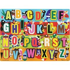 This hand-painted, playfully styled Jumbo ABC Puzzle is sure to capture and keep the attention of curious young minds. The thick, chunky wooden puzzle pieces fit neatly into their spots on the colorful board and also stand up for additional pretend play. Puzzle features full-color images beneath each piece to guide little ones. Measures 16"H x 13.8"W x 1"D.My son is 19 months old. Knew approx 10 letters. Introducing this item to him he now verbally knows 15 letter (3 weeks later)and 20 just by sight. He places every one in the slot it belongs. The slot allotted for the letters are printed the same as the block letter. It helps them located the letter by color and shape. It also helps motor skills. I praised him when he gets the correct letters in. He now praises himself by clapping his hands when he completes the puzzle.
