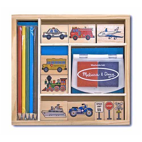 Water, road, track or air this wooden stamp set has it all! Includes 10 wooden vehicle stamps, 5 colored pencils and durable, two-color stamp pad. Washable, non-toxic inks.