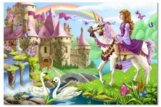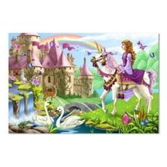 Welcome to this enchanting scene where swans glide in the pond, butterflies flutter around the castle and the princess rides her unicorn. 2I bought this puzzle to keep on hand for my gr.daughter's visits; she will be 3 in a couple of months. She enjoys it when we sit together on the floor and piece it together. She is able to connect many of the parts by herself, and I imagine she will get better with practice. I don't know if her interest would last so long without an adult working along side her; however, that could all change as she becomes more adept. But, it is a lot of fun to work side-by-side; I can see the little wheels turning as she decides where to place a particular piece; there is definitely some reasoning taking place. I will purchase a couple more Melissa and Doug puzzles because they are much better constructed than what I have found in the discount stores. I am, however, disappointed that Melissa and Doug products (at least some of them) are now being manufactured in China. Of course, it is hard to find a 48 or more piece puzzle that is not. Oh,I do keep it out or reach because I don't want to lose any pieces! It would be great if they would create a site where you could order missing puzzle pieces.