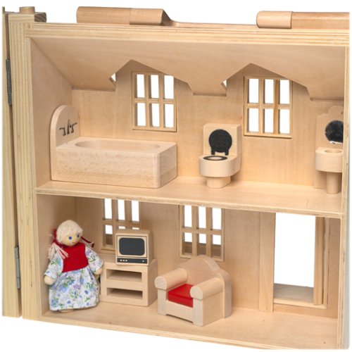 - Features working doors, two flexible wooden play figures, eleven wooden furniture pieces