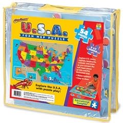 Explore the U.S.A. with colorful foam puzzle play! Travel cross-country through this beautiful, giant 2' x 3' puzzle of the United States. Children can explore America's states, capitals, landmarks, animals and more through hands-on play as they connect the pieces of this illustrated map. Includes 54 interlocking, water-resistant and easy-to-clean puzzle pieces.Never did I think my 4 yr old would love this, but he chose it to put on his list for Santa. It came and he plays with it constantly. The case is a huge plus. Very durable foam with great colors and fun pictures. Capitols included. Agree that I would have liked the states to be the puzzle shapes, but for my 4 yr old, he loves it. Great value.