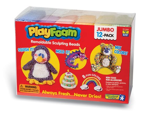 The new playfoam Jumbo 12-Pack gives you more foam to squish, shape and mold. This double-decker package includes two amazing new colors -- purple and gray -- along with playfoam classic colors: yellow, blue, green, orange, pink and white. We've even doubled the colors kids use most (yellow, blue, green, white).playfoam never dries out and won't crumble or stick to skin or other surfaces, so clean up is always a snap. playfoam is nontoxic and non-allergenic.