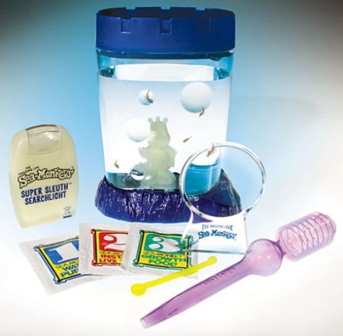Now, all that is necessary to explore the mystery of life is provided in this spectacular set. You get all you need to create life from seemingly lifeless powders and tools to see, first hand, the miracle of a living creature exit its time-traveling egg capsule and grow into a fascinating adult! The 50 mm, 3X magnifier provides you with the power to see the growth stages of one of the worlds most interesting and specialized life forms...sea-monkeys. These hybridized Artemia nyos live 10 times longer than their wild cousins. They also grow bigger, faster and have more babies.Includes: