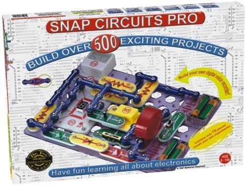 Elenco snap Circuits Pro 500-in-1:Elenco's new snap Circuits makes learning electronics easy and fun! Just follow the colorful pictures in our manual and build exciting projects such as FM radios, digital voice recorders, AM radios, burglar alarms, doorbells and much more! You can even play electronic games with your friends.