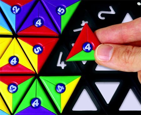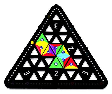 spectrangle is the fast-paced game of skill and numbers. Strategically place your game pieces ("trangs") where they'll earn you the most points, all while making it harder for your opponents to place their pieces. The more sides you match, the more points you score. Take the offense or the defense, but score the most points to win the game. Board with recessed game spaces fits securely inside the included plastic carrying case, making it perfect for home or travel. Includes game board, 36 multi-colored trangs, 8 score pegs, cloth bag and guide. For 2 to 4 players or teams.