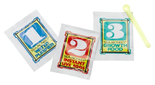 - Each mini world features #1 Water Purifier, #2 Instant Live Eggs, #3 Growth Food, a Calibrated Feeding Spoon, pipette, a trilingual user guide, a Sea-Monkey Insurance Form with a 2-Year Guarantee, a Mini-World Tank, and exclusive magnifying lid.