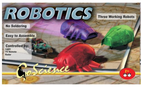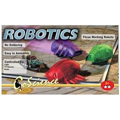 Assemble three fantastic robots with this kit! One robot detects objects using infra red rays, the wake-up robot is sensitive to light and the third robot is operated by any TV remote control. A separate circuit and body are supplied for each robot. Includes over 20 pieces. Switch, motor, gear, motor housing and body included. Requires 2 "AA" batteries, not included. Measures 5" x 5".Great present that provides excellent learning opportunity and lots of fun. Boys love it!