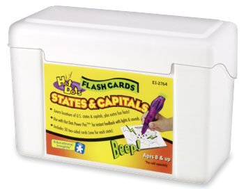 Each flashcard quizzes a state's location on one side and the state's capital and major cities on the other. Learn state birds, flowers, nicknames, and other facts. The hot Dots Power Pen (EI-2770, sold separately) provides instant feedback, allowing kids to play and learn independently. Incorrect answers get a 'boing' from the pen, and the correct answer gets one of four fun positive sounds. Includes 50 two-sided cards (one for each state), guide, and comes in a durable plastic storage box.Images ScreenShot