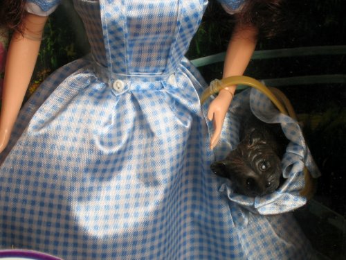 - Carries black Toto dog in basket w/blue & white checkered fabric in basket.
