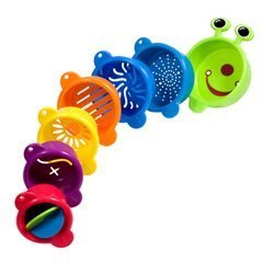 9 months & up. Link like a caterpillar, stack like a pillar! Colorful cups have different designs of sieves on the bottom. Use with sand or water. Set of 7.