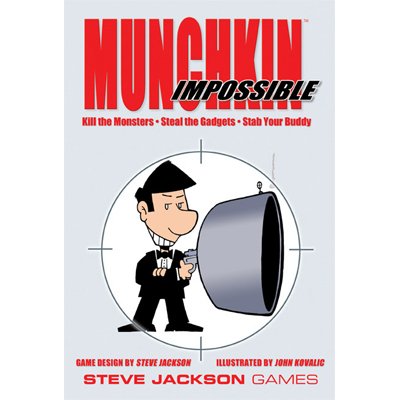 Now available . . . a new stand-alone Munchkin game! The Munchkins are now spies . . . eliminating the opposition, playing with self-destructing gadgets, and changing loyalties even faster than they change hats. Be a Playboy, Tourist, or Assassin. Report to the Americans, Russians, British, or Chinese (it'll change!). Wield gadgets from the subtle Cigarette Dart Gun to the amazingly unsubtle Bazooka with Incendiary Ammo. Eliminate foes, from the pathetic Defective Defector, through the Interro-Gator and the Not So Secret Police, up to the mighty Super Spy himself. And (all together now) . . . Take Their Stuff! You can play Munchkin Impossible by itself, or combine it with any number of other Munchkin games for more shameless silliness.